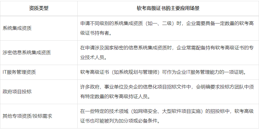 计算机软考高级证书在企业资质申请中扮演着重要角色,尤其对于从事信息系统集成、IT服务等相关业务的企业而言,它甚至是参与项目投标和维持企业资质的必要条件之一。
