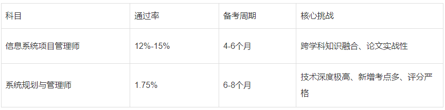 在软考高级科目中,系统规划与管理师(系规)与信息系统项目管理师(高项)常被考生列为“二选一”目标。两者虽同属高级,但考试内容、通过率、备考难度差异显著。