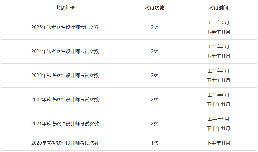 从近几年软考软件设计师考试安排来看,2026年软考软件设计师考试仍有2次,分别安排在上半年的5月和下半年的11月。