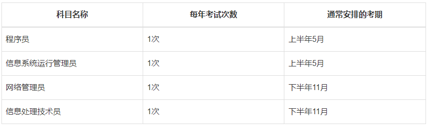 软考全国统一每年举行两次,但具体到初级的不同科目,开考频率有所不同: